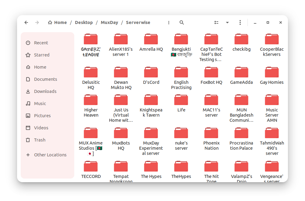 MESSAGES.logfile is stored within subfolders relating to the text channel it was recorded from, which are located in folders named after the servers themselves.