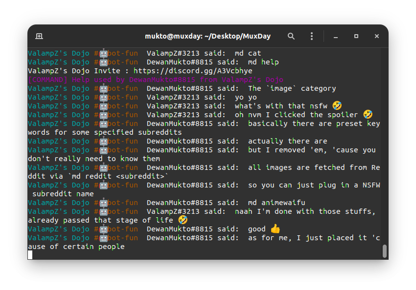 logwritefunction call.if (message.content) { // ... other lines of code console.log('\x1b[36m%s\x1b[0m',message.channel.guild.name,"\x1b[33m#"+message.channel.name,"\x1b[0m", message.author.username + "#" + message.author.discriminator, "said: ", message.content); // ... other lines of code };Don’t worry about the weird escape characters and strings in front of the variables. They’re there to ‘color-code’ the output neatly.